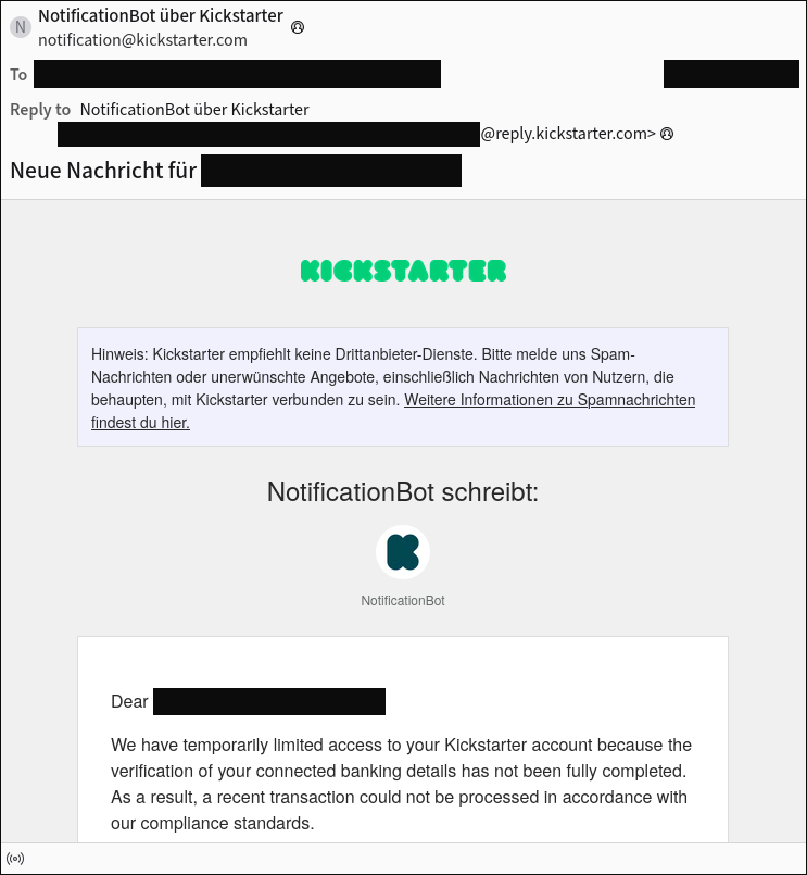 Damit liegt es an dem Benutzer die Phishing-Nachricht als solche zu erkennen. Kickstarter selbst hilft hier aber sogar. Sie warnen direkt am Anfang der Benachrichtigungs-E-Mail mit einem Disclaimer und einem weiterführenden Link, der über Spamnachrichten informiert.