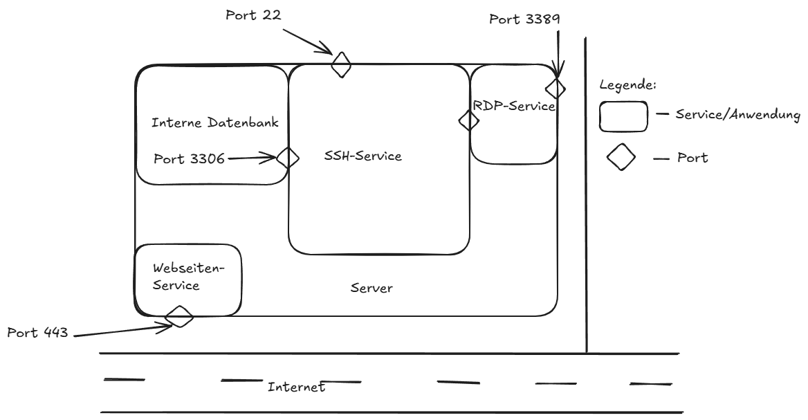 | SSH-Service | Mitarbeiter können sich direkt am Server anmelden, um diesen zu Warten | Ja | Mitarbeiter | Authentifizierung nur mit gültigen Zugangsdaten möglich |